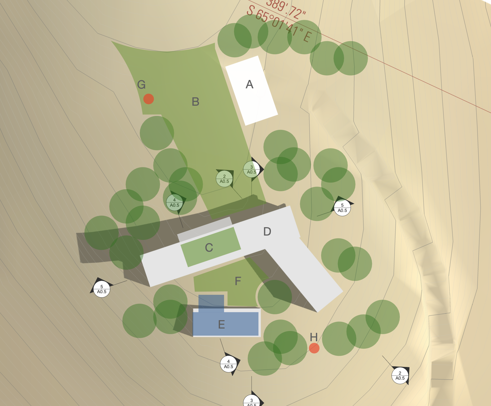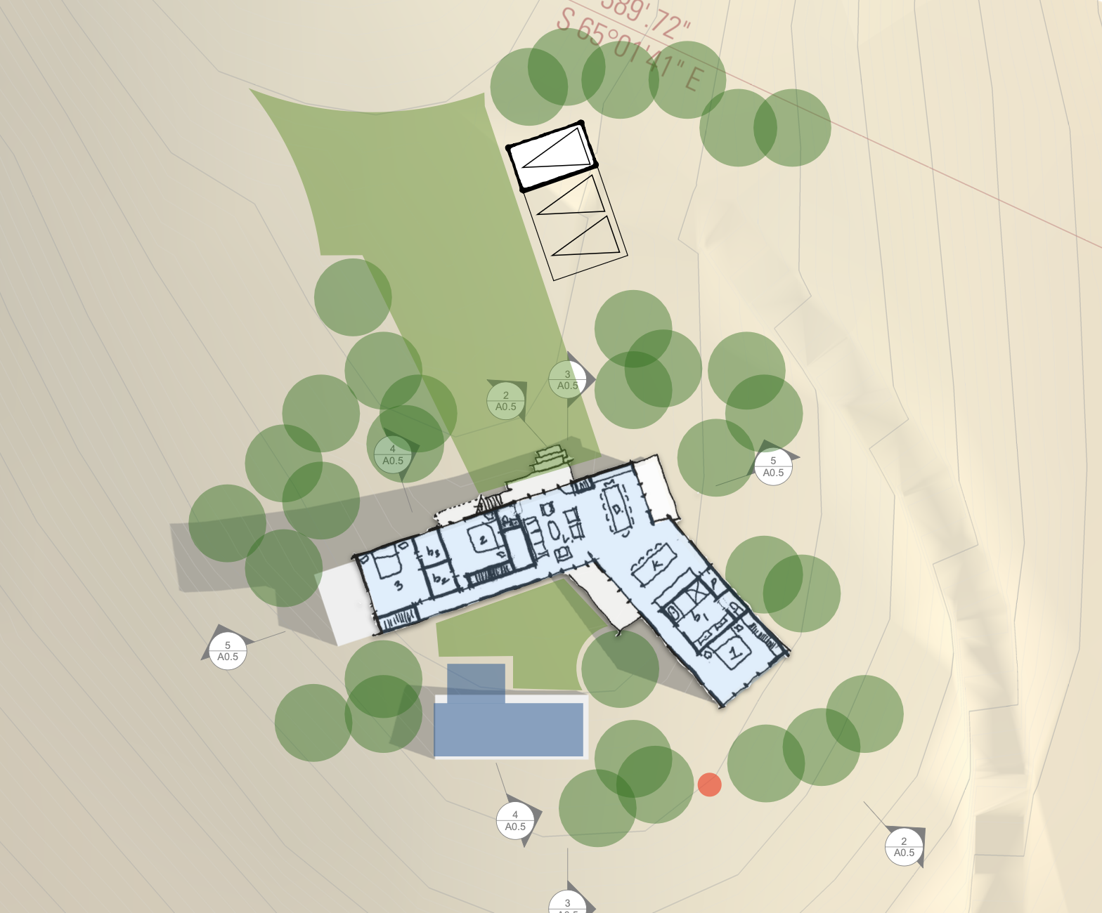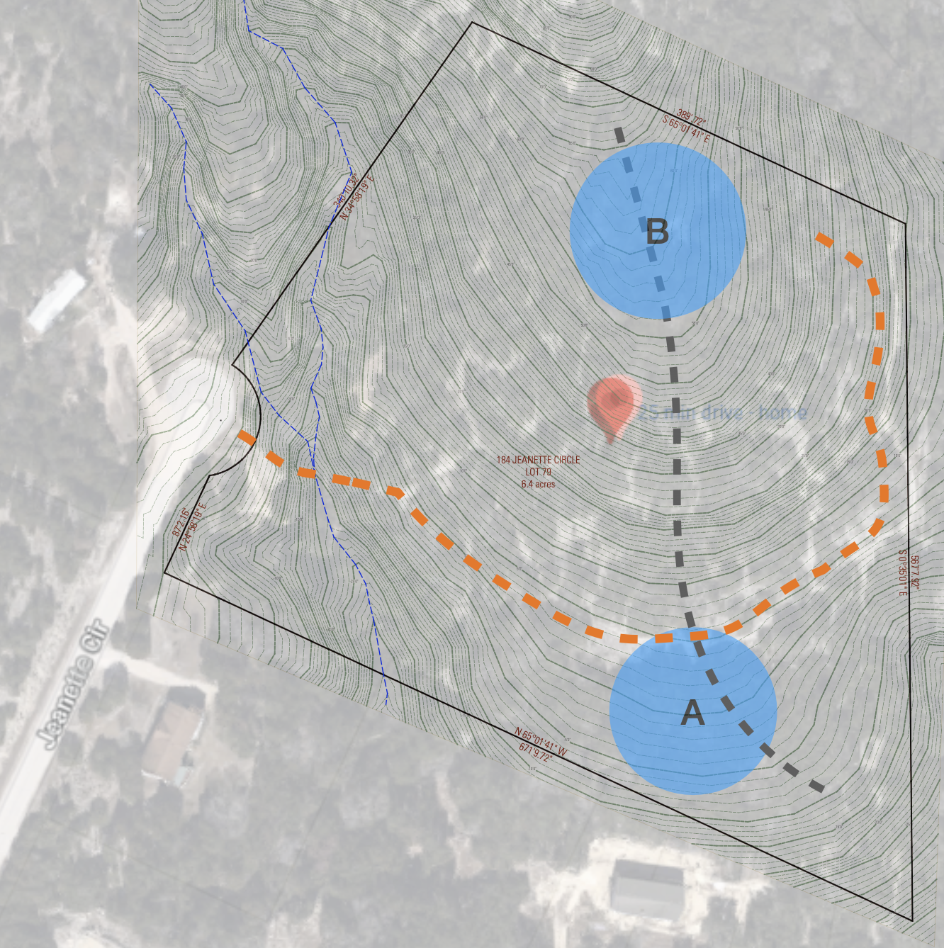 Very private 6.43 acres at the end of a two lot only cul-d-sac. Heavily wooded, many native plants, with a wet weather stream and grotto at entrance. Beautiful views of the valley and neighboring ridgeback mountains. City water and electric are available at the street; minimal building restrictions. See below building sites A and B identified by an architectural feasibility study. Ask to see additional details.